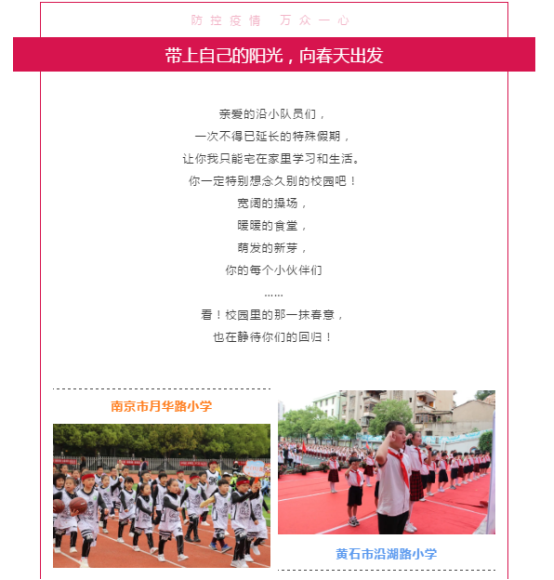 沿小的小伙伴们,为了早日结束这场艰难的病毒防疫战,让我们再耐心地等一等吧。在家里安心的生活,合理的安排学习,期待大家早日回归校园,沐浴在明媚的春光中。那时候风景秀美的黄石也一定会迎来更多的客人,泛舟大冶湖,相约小雷山。