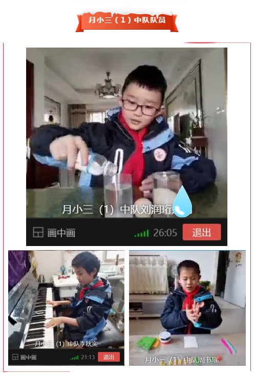 本次QQ线上学习活动主题是“宅家学习分享会”,是一次学生寒假生活学习的分享聚会。来自武汉省黄石市沿湖路小学三(2)中队的陆芯妍、曹烨超、潘瑀惞等6位队员、伟德可信任网站的周书瑶、李秋实、刘润珩3位队员,分别展示了寒假里的“宅家小法宝”。同学们的分享精彩纷呈,展示了自己的书法、钢琴、舞蹈才艺,分享经典的阅读书目,制作有趣的手工和科学小实验……在这个冰雪消融的时节积蓄力量,期待春暖花开时的勃发。