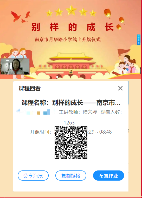 看着屏幕中冉冉升起的国旗,听着庄严肃穆的国歌,这一切仿佛都在说,“加油!我们一定可以战胜病毒”。孩子表情严肃地对我说:“我一定要好好学习,未来成为一名有用的人,为祖国贡献自己的力量。”新型冠状病毒虽然拉远人了人与人之间的距离,但南京市月华路假期中“停课不停学”的丰富安排,却让孩子们度过了一个终身难忘的寒假,不经意间拉近了人与人之间心的距离,拉近了我和孩子的距离。