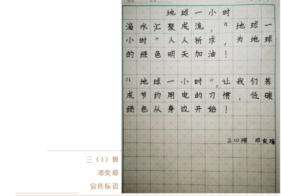 除了这一小时,在今后的生活中我们更要时时刻刻将“保护环境,从我做起”放在心中。月小同学们集思广益,提出多种节能减排行动,倡导绿色生活。二(3)班的蔡雨菡同学精心准备,写下了地球一小时倡议书。三(1)班的邓奕璋同学专门设计了宣传标语。三(1)班的蔡铭盛同学更是通过视频,清晰介绍了作为学生,我们可以为节能减排做哪些事。