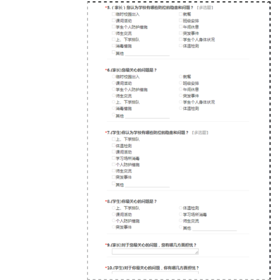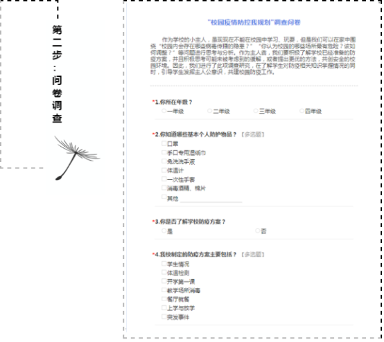 第二步:问卷调查。所有人都很关心校园防控,那你清楚学校已经对哪些方面制定过应对方案吗?哪些方面又是你特别关注的呢?为此,同学们设计了一次问卷调查。