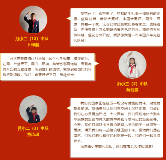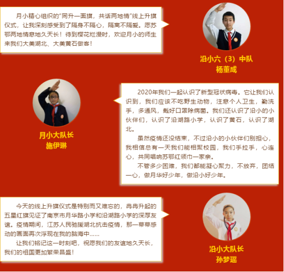 点燃星星火炬,我们与爱同行。在抗击疫情的特殊时期,希望这场特别的升旗仪式,让我们两校少先队员的友情更加深厚,让我们手相牵、心相连,心怀感恩,坚定信心,共同迎接抗疫胜利的到来!