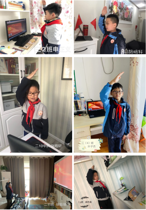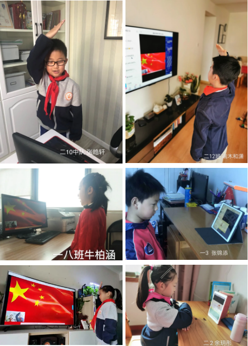 所有学生都静静地站立在电脑旁或者手机旁,等待着升旗仪式的举行。伴随着铿锵有力的《义勇军进行曲》,线上升旗仪式正式开始,一年级同学向鲜艳的五星红旗行注目礼,二、三、四年级的少先队员行队礼,一身整齐的校服,一条鲜艳的红领巾,让屏幕前的他们显得更加有精气神。