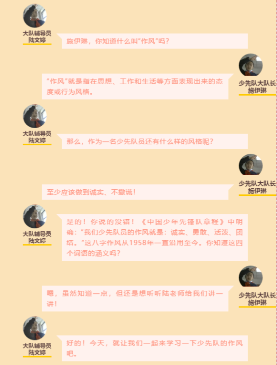 在此特殊时期,4月23日(上周四)晚上7点半,大队辅导员陆老师为一年级的“小月芽”们开设了一次线上队前教育课。共同学习了少先队的历史、少先队建队日的由来和少先队“六知六会一做”等相关知识。