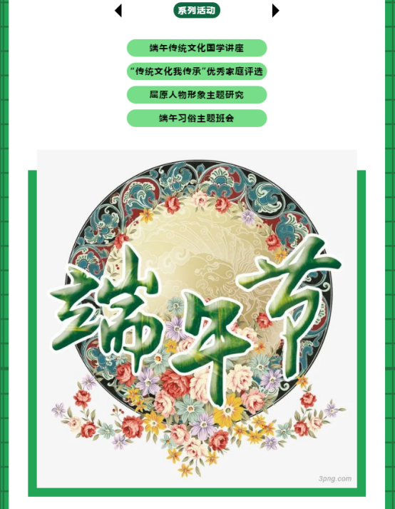 本次端午节系列主题活动还将围绕“传统文化我传承”这一主题,以家庭为单位进行主题实践。可以和家人一起包粽子、做蛋兜、制香囊……用镜头记录下你们家庭活动的精彩瞬间,让优秀传统文化的种子在每个家庭里生根发芽。