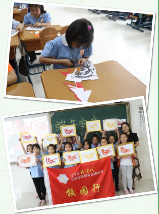 首先,班主任老师介绍了端午节为什么剪纸,原来是借此征服鬼魔、毒虫、瘟病等,民俗艺术剪纸题材均为老虎、雄鸡、葫芦、艾草等吉祥神物,趣味满满。