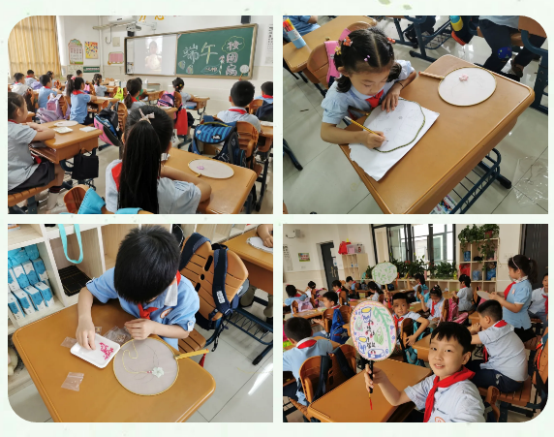 特别的云上授课,多样的主题班会,为“小月芽”们带来了丰富的“非遗文化”活动。玩转香囊、蛋兜、团扇、彩灯、面塑、剪纸、草编等特色活动在各班级同时上演。灵巧的小手、专注的神情、幸福的笑脸……浓郁的端午文化气息在教室里弥漫。
