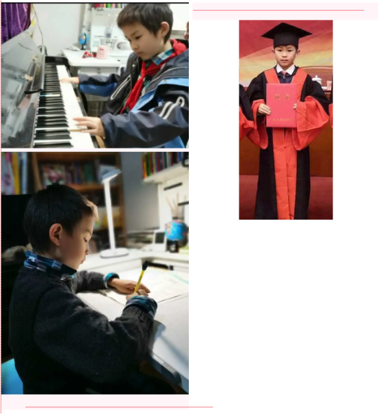 他兴趣广泛,喜欢钢琴演奏,荣获2020 SAE全国青少年钢琴大赛暨德国莱茵古典国际钢琴比赛江苏省赛区二等奖,亚太区决赛三等奖,在“苏鄂红领巾手拉手”活动中,通过网络直播,在线钢琴演奏《菊次郎的夏天》,用音乐陪伴疫区的小伙伴,用音乐传递爱。