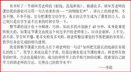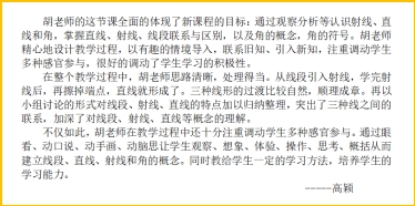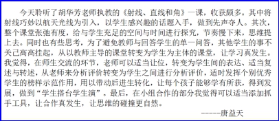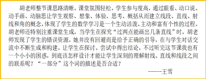 《射线、直线和角》是苏教版新课标小学数学四年级上册的内容,这部分内容是在学生已经初步认识了线段、角和直角的基础上进行教学的,是几何形体中最基本的概念之一,也是认识几何形体的基础。这堂课需要掌握的知识点多,而且比较抽象,胡老师从学情出发,通过迁移、观察、分析等认识直线、射线,掌握直线、射线、线段的联系与区别,以及角的概念、角的符号。在教学过程中,胡老师也积极引导孩子们主动地学习新知,师生交流尽量实现数学隐性知识的显现化,让他们深刻的理解和掌握线段、射线和直线这三者之间的涵义和区别。课堂中,胡老师还安排了小组合作的活动环节,这些都充分体现了学生在学习过程中的主体地位,不但给学生提供了一个自主探索的空间,同时培养了学生的合作意识和自主探索能力。整堂课自始至终让学生经历观察、体验、操作、猜想、验证、思考、概括等数学活动,在活动中促进孩子知识经验的累积,也体现了学生的数学学习是一个生动活泼、主动和富有个性的过程。