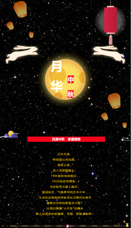 一轮明月,几缕清风,五彩画笔,尽情挥洒。一把把精致的秋扇,一幅幅别样的“月?华”中秋图,书写了“小月芽”们的无限畅想。点点笔墨,勾勒了心中的满月,描绘了嬉戏的白兔,点缀了喷香的桂花......五千年的锦绣山河,中秋的月明星繁,画不尽的是心中的绵绵情意......