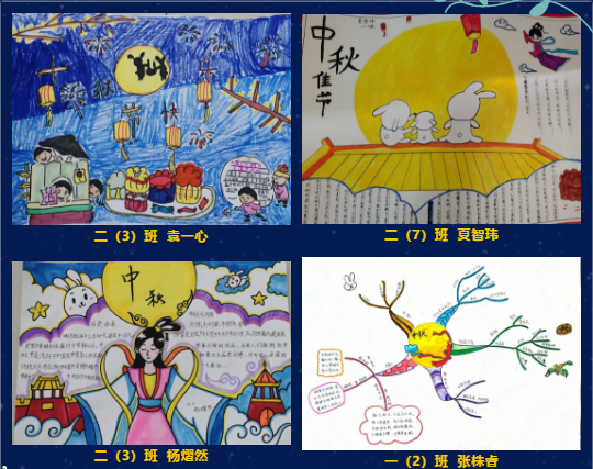 低年级的“小月芽”们纷纷行动起来,在爸爸妈妈的帮助下,他们用心收集素材,认真甄选视角,用自己最独特的方式深度探究着“中秋节”的文化内涵。