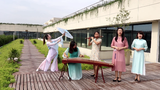 揽月台前,一袭华服,一把竹笛,一架古筝,老师们迎风而舞,对月而唱。深情的吟诵,醉人的笛声,曼妙的舞姿,挥洒着的是不变的家国情怀!