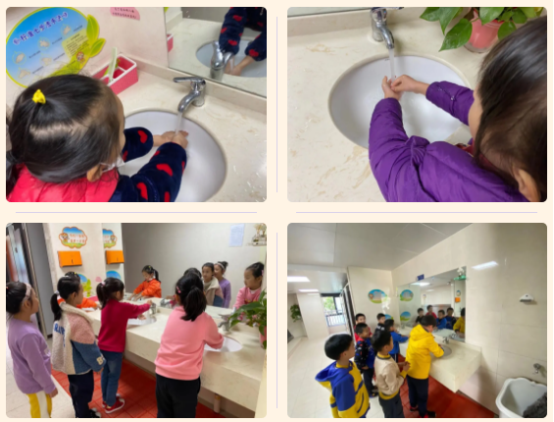 在进餐前,我们要在老师的带领下去洗手间洗手。小彩虹们,洗手时先把小手淋湿,涂上香皂,再运用正确的七步洗手法洗手,冲洗干净后关上水龙头用毛巾把小手擦干净,做一个讲卫生的小彩虹哦!快来看看谁的小手最干净呢!
