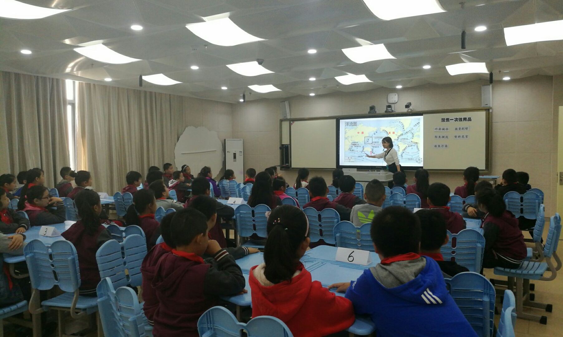 胡蓉老师在短短40分钟内,充分展示了她的教学风采和教育理念。课堂从对三个单一事件的理解和分析,到综合思考联系得出保护环境就是保护我们自己的观点,最后在教师的引导下学生针对问题自主设计减量措施这几个环节来开展。教学中运用多种教学手段,充分调动学生的积极性,让学生在课堂中“动”起来。
