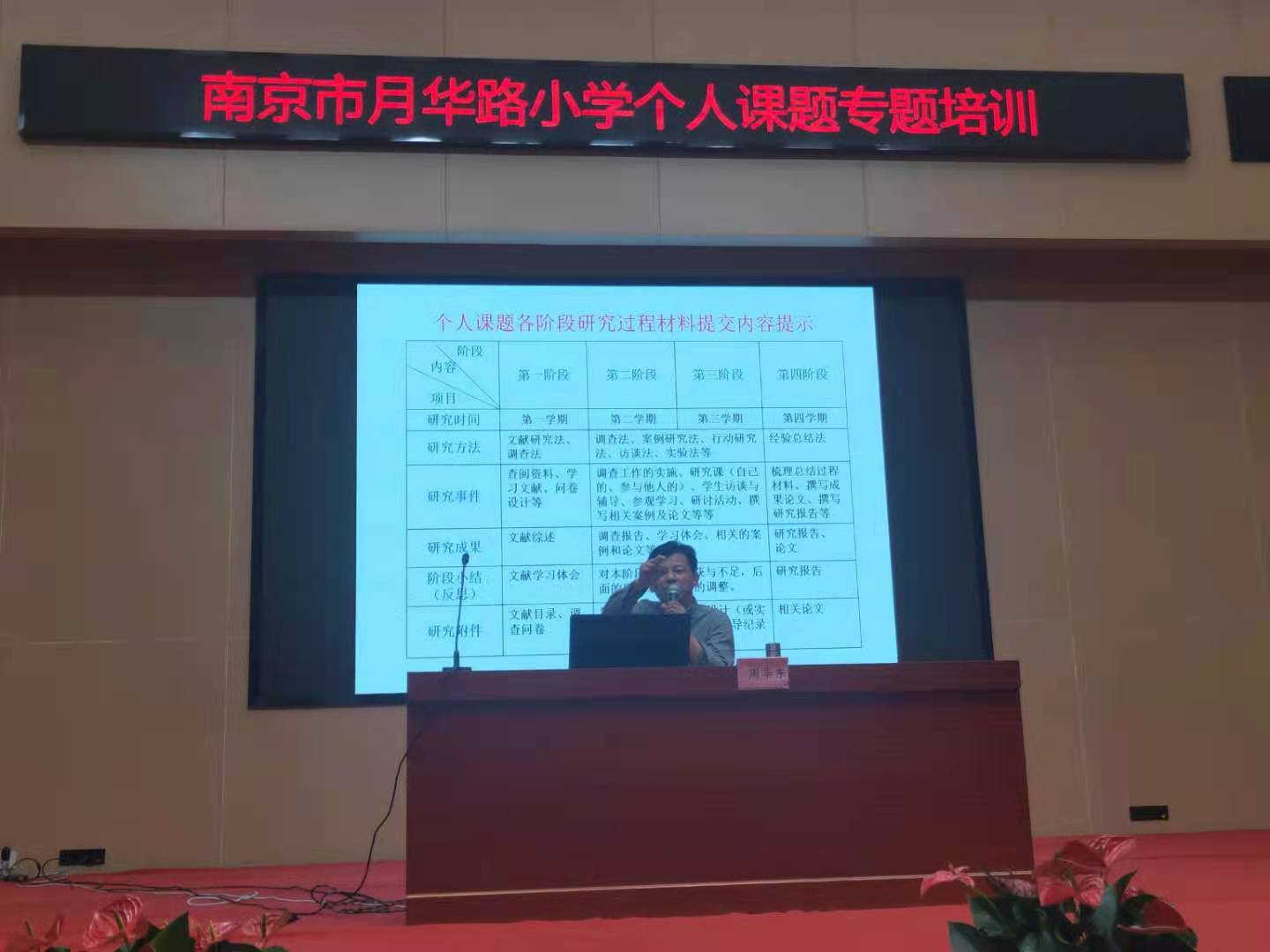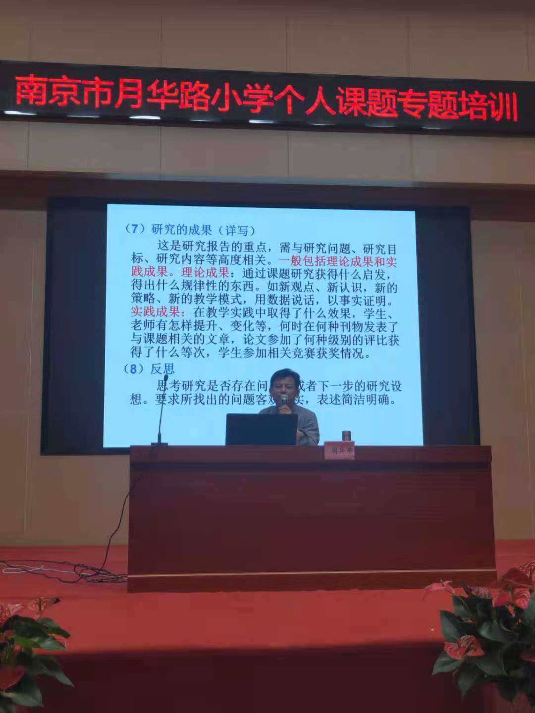 周华东主任就结题报告的撰写开展专题讲座, 深度剖析了个人课题的特点,强调了个人课题作为 “必备项、重要项”的巨大作用,同时明确了其渠道单一、周期漫长、结题难度大的特点,充分提升了教师们对个人课题结题工作的重视程度。他还从个人课题研究报告的结构出发,点明“课题界定、课题目标、课题内容”需要教师在修改和完善中力求做到科学与准确,并就如何写好“研究过程”提出“时段性、任务性、方法性、步骤性、策略性、结论性”六个方向,明确课题研究“五个一致”的基本要求。