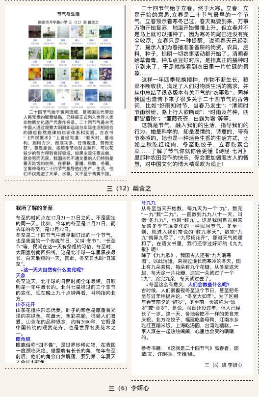 善思者善学,善学者善思。三年级的“小月芽”们在参观太阳历广场时,发现此刻正值冬至时节,太阳历的影子真的指向了地面上的“冬至”。孩子们对于古人利用影子就可以判断日期和时间的本领产生了浓厚的兴趣,于是在爸爸妈妈的帮助下,他们找寻各种书籍和资料,把自己的所思所想撰写成了一篇篇精妙的小论文。冬至的习俗、冬至的来历、“土圭法测影”、这一天大自然的变化在他们的笔下变得异常生动而又富有趣味!