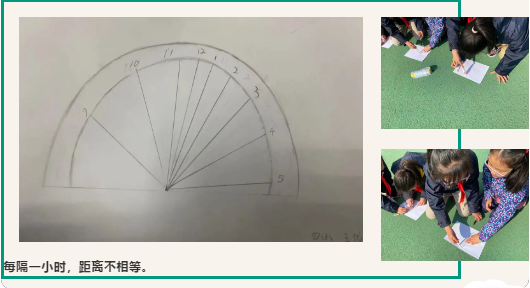 时间是检验真理的唯一标准。在生活中,我们不难发现一天内物体影子长度的变化规律是由长变短再变长。结合学校的太阳历广场,李老师带着四年级的“小月芽”们利用科学实验探究光与影的秘密,研究一天中物体的影子在不同时刻的位置,他们发现每相隔一小时,影子间隔就会变得大小不同。