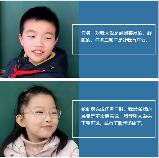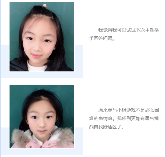 任务三:在小组包围圈内大声地说出“我是一个( )的人。”从性格、兴趣爱好、特长、身体特征等方面说五个句子,例如:我是一个勇敢的人;我是一个爱跑步的人……挑战任务的过程中,小月芽们都有怎样的感受呢?