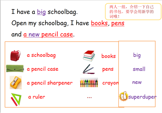 通过对比新书包和旧书包图片,处理生词new,帮助学生理解。