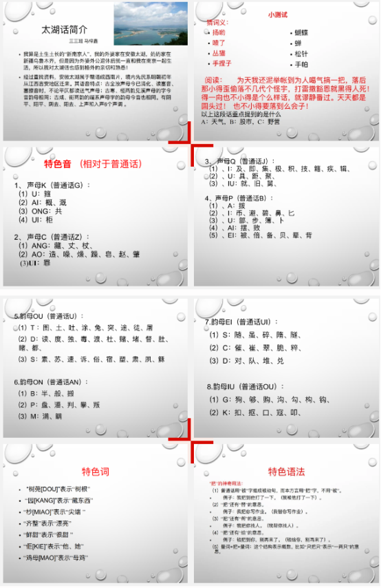 方言是一个家乡的重要名片,有时,仅一街之隔的两个乡镇,地方方言就有着巨大的差别。你能对比出家乡方言和普通话的表达异同吗?你能说出每句方言背后又会蕴藏着的生活趣事呢?金陵的语言美,从来不只是一面。南京,一个极具包容性的城市,秉承着兼容并蓄的理念,让各地的语言在这里生根,开创了“各美其美,美美与共”的语言新局面!三(6)班的张恒祎在爸爸妈妈的帮助下,从小区人员的流动、不同年龄段人语言的使用等方面入手,模仿科学家收集、整理相关的方言数据;三(3)班的马梓鑫用心制作课件,采用小测验、特色话等别样的方式展示着“太湖话”的与众不同;三(1)班的冯薪陶从人文、物产等多个角度诠释着“东北话”的妙语连珠。