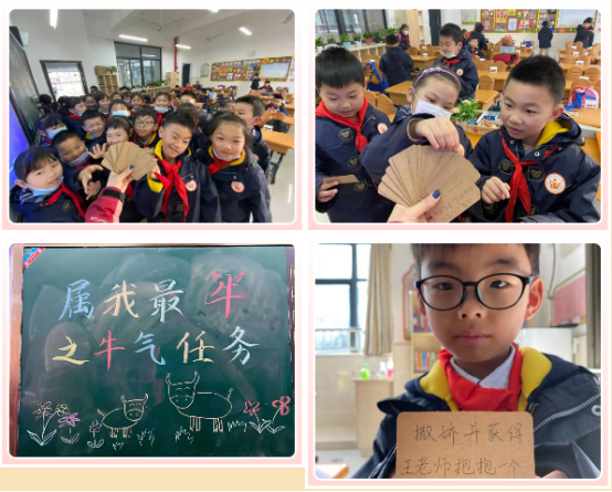 二(2)班的迎新活动别具特色。“属我最牛之牛气任务”活动中,孩子们任意抽取一张属于自己的牛气任务卡,用牛气任务开启新学期,用爱拉近了心与心的距离。每一张任务卡都是独一无二的,有为集体服务,如给A类图书排排队、为水池洗洗脸、第2小组桌肚大清仓……有考验智慧,如猜字谜、成语接龙、 成语故事……有“戏精”派的,如表演九牛二虎之力、气喘如牛等等,还有抱抱老朋友、向王老师撒娇等充满人情味的任务。这些有趣的欢迎方式拉近了同学之间的距离,让他们迅速地融入班集体,增强了集体荣誉感。