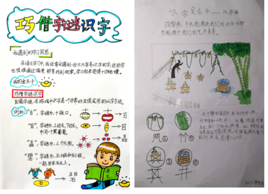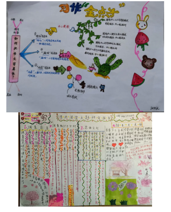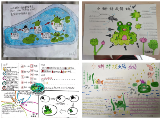 低年级的小月芽们在预习《小蝌蚪找妈妈》这篇课文时,以丰富的形式和鲜艳的色彩展示了自己对课文的理解,有的给课文画下了插图,有的设计了问答表,有的还模仿用思维导图将课文进行了梳理。