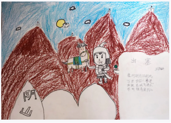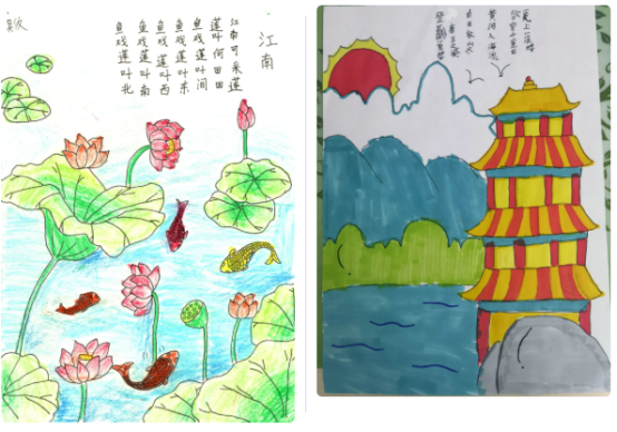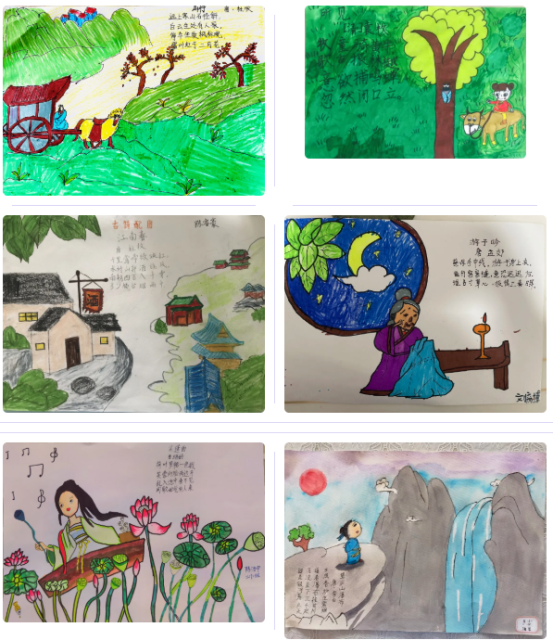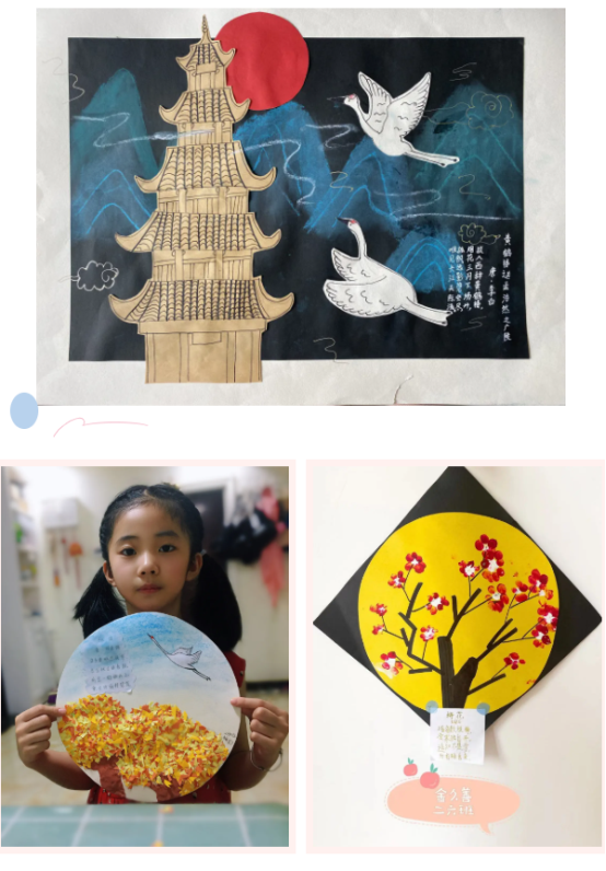一(4)班梅宸夕、二(2)班宋梓乔和二(6)班金久善同学匠心巧思,用点、染、剪、拼、贴等多元技法创作古诗插画,令人眼前一亮,感受到小作者在创作中不由自主地流露出对古诗的喜爱。