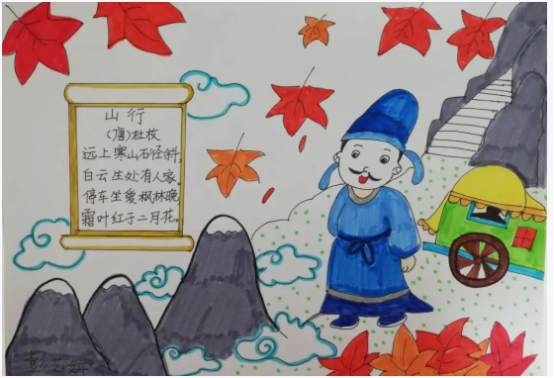 二(3)班的彭艺妍同学为《山行》一诗画了一幅红叶飘飞图,表现了诗中的“枫林晚”之美;