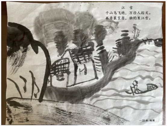 一(2)班的杨博同学用数笔黑墨勾勒出一幅《江雪》图,孤清寂寥……