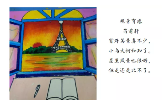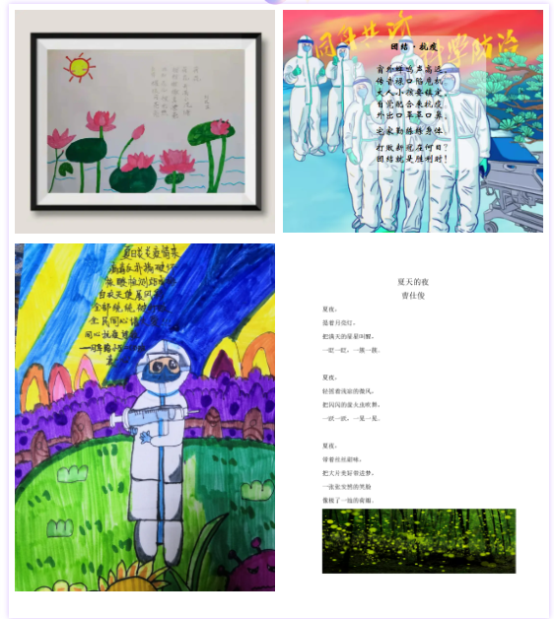 有些小月芽在诵读古诗,品析古诗之时,不禁起了“诗兴”,他们结合当下心境,有感而发,创作了属于自己的,饶有稚趣的诗歌。二(9)班的芮前轩同学在居家学习的这段时间里,看着窗外景致却无奈不能出门,创作出《观景有感》这首小诗,字里行间透露着对疫情早日散去的期盼,一句“屋里风景也好”,既有小作者的自我劝慰,又表露出对屋外玩耍的渴求,十分富有童真童趣。小月芽们的创作的诗歌有些是写夏天的夜色的,有些赞颂了抗疫工作。同学们不仅创作诗歌,还利用诗与插画创作装饰画,点缀了家中温馨的环境。