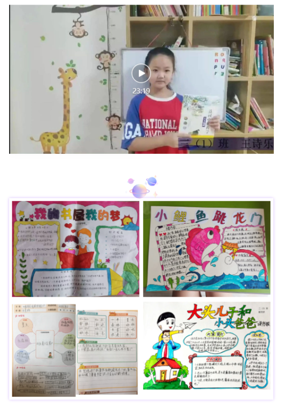 温儒敏教授曾言“语文教学,最重要的是培养读书的种子”。在这个暑假期间,小月芽们根据《教育部中小学生阅读指导目录》书单,在班级语文老师的指导下,选好书,读好书。他们将自己读书的收获和体会,用电子小报或者手抄报的形式展现出来;选择自己阅读中最感兴趣的部分内容,以视频录制的形式,进行了阅读分享;他们根据自己的阅读体验,进行故事创作,并为自己的故事配上精美的插图;还有的将自己在阅读过程中提炼归纳出来的阅读方法,进行整理,撰写阅读“金点子”研究报告,与大家分享。