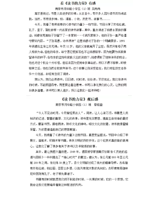 “读书能养气,乃为善读书。”《读书的力量》是一部纪录片,再现了东西方文明史中那些文明巨人的著作形成或影响历史的伟大故事,展现的是读书与文明史的深刻关联,揭示了人生的高度与读书之间的关联,读书的祖传家训具有启示教益价值,展现了全民阅读在中国的实践历程,及对社会产生的深远文化影响。中高年级的小月芽们观看后深受启发,忍不住拿起笔来记录下自己点点滴滴的心得体会。
