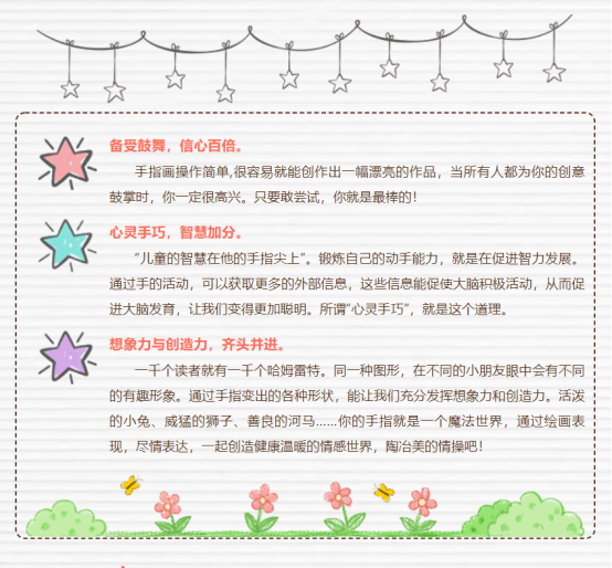 艺术是我们人类感受美、表现美和创造美的重要形式,也是表达自己对周围世界的认识和情绪态度的独特方式。而手是孩子们日常生活中最常见到和最常用的,一双小小的手,它不仅能做许多事,还能创造出艺术,让我们的生活变得更加多姿多彩。
