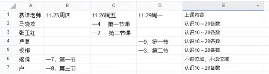赛课内容为珠心算第一册第四单元《认识10~20各数》以及《不进位加、不退位减》。第12周以备课组为单位进行赛课,每组评选出两位教师参加第13周的校内赛课,共有6人。比赛主要分为三天,2021年11月25日、26日、29日,每天有两名老师进行赛课,具体安排如下: