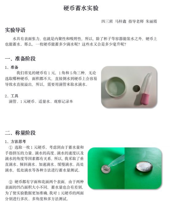 它孕育生命,是万物的母亲;它海纳百川,有着广博的胸襟!你知道它是什么吗?它就是人类生活的必需品——水!同时也是小朋友们喜爱的“玩具”!我们在学习苏教版四年级上册第一单元《升和毫升》期间做过这样一个实验:先用滴管吸入1毫升水,看看1毫升水有多少,再把它滴在手心上,数数大约有多少滴。同学们通过这个实验知道了,1毫升水只有很少的一点点,大约十几滴的样子。细心的同学有没有发现,当每一滴水轻轻地滴在我们的掌心时,它们并没有一下子散开,而是慢慢聚拢成了一颗大水珠,这是为什么呢?如果我们把手掌心换成一枚1元钱的硬币,在这1元钱的硬币上一共能滴多少滴水呢?有没有办法让我们在1元钱的硬币上滴更多的水?是什么影响了我们滴水的多少呢?
