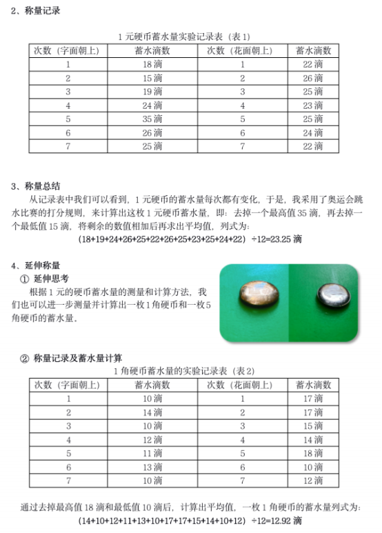 本高阶学习任务以水为研究对象,借助硬币,让孩子们一起玩转数学!大家都知道杯子能装水,那么硬币上能存水吗?这时候可以利用我们四年级上册刚学过的《升和毫升》这一单元的知识解决,用我们的滴管向硬币上滴水,可能最多存多少滴呢?又是多少毫升呢?水在硬币上又会出现什么神奇的现象呢?通过硬币蓄水游戏,让学生知道硬币上最多能存多少滴水,了解自然界中的很多现象与我们的认知是有差异的,会运用科学实验去验证猜测并得出结论,激发科学探究的意识。在实验中培养学生动手能力、发现问题和解决问题的能力,促进学生养成节约用水的习惯!