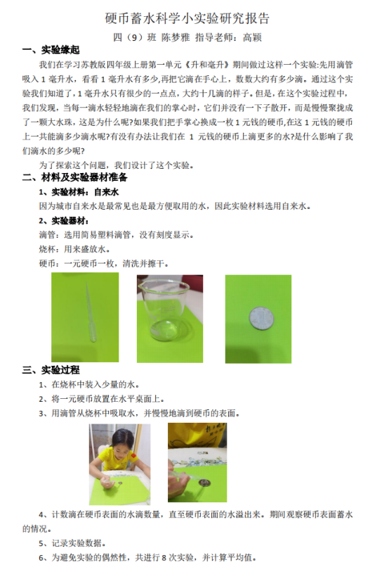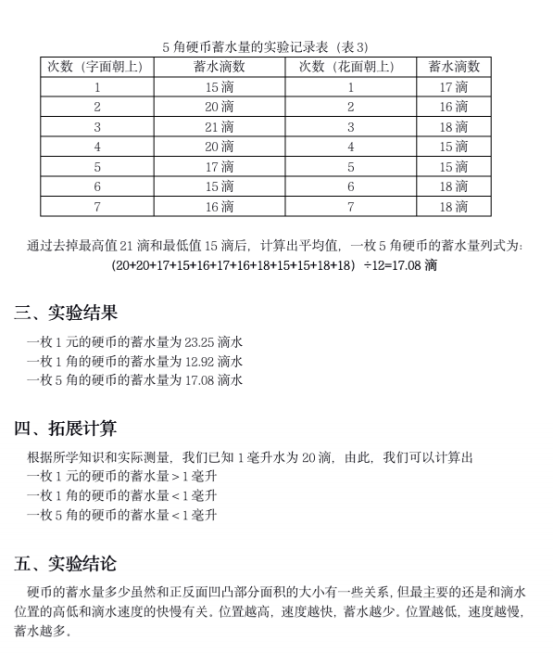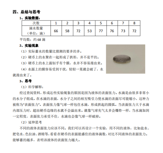 1.通过实验知道硬币上能存多少滴水,知道这些现象都与水的表面张力有关;
