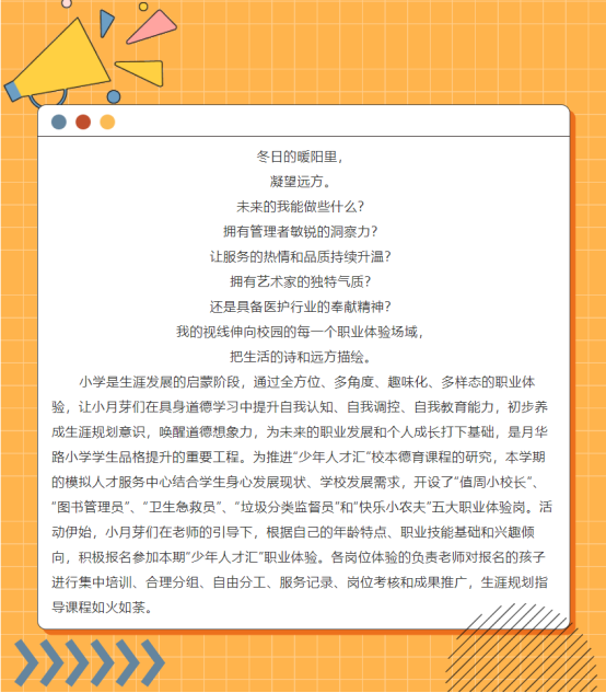 做一份工作,尽一份责任。岗前培训让“小校长”们了解了自己的职务,明确了自己的责任。在培训会上,“小校长”自信地描述着自己的管理能力、人际交往能力、观察能力和表达能力,胡蓉老师根据他们的自我介绍,初步进行了工作分工。“小校长”们的值周工作任务可不轻呢,包括来人来访审核、安全巡查、定期查看小校长信箱并回复反馈、撰写值日周记、召开“金点子”发布会......一项项工作对于新上任的“小校长”来说是个不小的挑战,但是他们用灿烂的笑容表达对这份工作的期待!