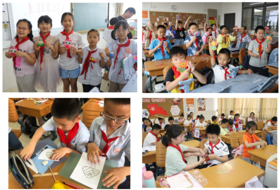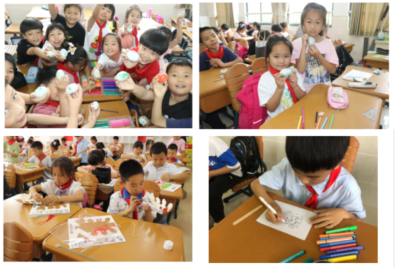 南京人过端午讲究给孩子编“五色绳”,那端午的斑斓色彩在哪里呢?三(1)班的黄老师和李老师带领孩子们一起手工编织五色绳,探索无色绳的秘密的活动。你看,一根根五色丝在孩子们的巧手下变成了一根根多彩的无色绳,轻轻地给老师系上、替同学系上,为他们送上安康长寿的祝福。四(2)班的小月芽们用画笔描绘出了自己眼中端午的色彩,简单的画笔,多彩的颜色,一幅幅精美绝伦、创意无限的端午团扇扇面作品令人惊叹!二(3)班的端午鸭蛋被孩子们绘制成一枚枚彩蛋,印刻下对父母的深情。二(5)班的教室里传来孩子们的欢笑,精致的水波纹,有力的船桨,在丰富的想象中一艘艘可爱的小龙舟在教室竞相争渡!