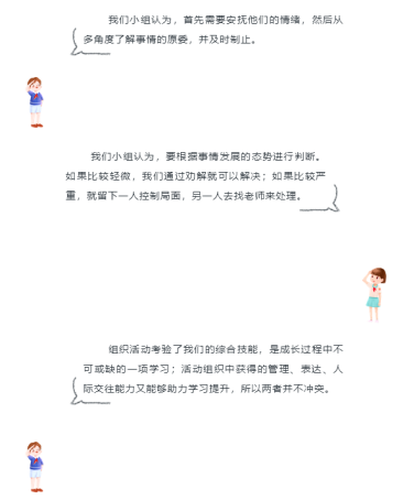 在日常学习生活中,队员们难免因为某些原因产生冲突。当队员们向大队干部寻求帮助时,我们又该如何发挥效能呢?你瞧,现场答辩活动中,我们的候选人们就“如何化解队员们之间的矛盾?”、“如何正确处理学校活动组织与学习安排?”两个问题展开讨论。他们小组合作,组内交流,并将想法汇总,进行现场汇报。