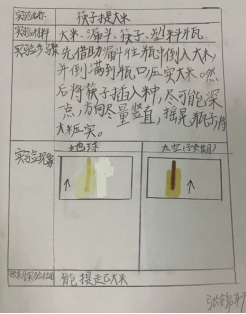 张锦轩同学特别喜欢探究科学中的奥秘,课后也特别喜欢做科学实验。这不,假期里,他又做了一个“筷子提大米”的实验。他先借助漏斗往瓶中倒入大米,并倒满到瓶口,压实大米;然后,他用尽力气将筷子插入米中,努力插得深一点,方向尽量竖直;最后,再摇晃瓶子,将大米压实。结果,他发现,只要用手轻轻提起筷子,瓶子里的大米也就被轻松提起。为什么会有如此力量?原来是“摩擦力”在帮忙呢!当他学习完“天宫课堂”后,“金问号”又钻出了他的小脑袋,经过他的思考与对比,他推测,“筷子提大米”这个实验在太空中也能将大米提起来。你相信吗?