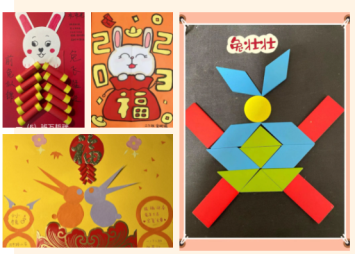 兔岁添福气,龙人奋雄程。数学跨学科主题学习是培养学生会用数学的眼光观察现实世界、会用数学的思维思考现实世界、会用数学的语言表达现实世界的重要学习方式之一。“双减”之下,在学校设计的寒假特色实践活动中,小月芽们“减除”了负担,“加”上了创意,“乘”现了风采,围绕“春节”这一中华民族传统节日,融合多学科实践,自主发挥,巧妙构思,呈现出一张张栩栩如生、内容充实的作品,以此加深对中国传统文化的理解,坚定文化自信。快乐的寒假生活不只是玩耍中的成长,更有知识的浸润,学习的积淀。小月芽们正携着冬日暖阳,在季节轮回的新岁中坚定梦想,留下快乐成长的印记!