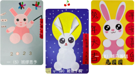 二年级的月小娃们设计的吉祥兔可谓是精彩纷呈,新年兔、乐乐兔、带着中国结一起来的癸卯兔、带着鱼儿一起来的鱼跃兔……各式各样的小兔子个个喜气洋洋,让人满心欢喜,可以想到这些“兔”的主人多么欢喜地迎接兔年的到来!