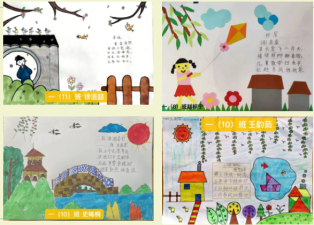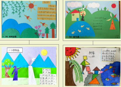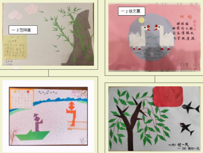 瞧,风和日丽之时,游览在泗水之滨,有低矮的江南屋檐、随风摇曳的细柳、无忧无虑的孩童、南归衔泥的燕子,以及先知春回水暖的一群群小黄鸭......这些作品不仅构图精美,而且充分描绘了诗歌的意境,还将平面图形无声又巧妙地内嵌于景象之中。小月芽们在这场综合实践活动中,邂逅了数学、语文和艺术交融盛宴,为落实“双减”政策,丰富作业形式,增添了浓墨重彩的一笔。