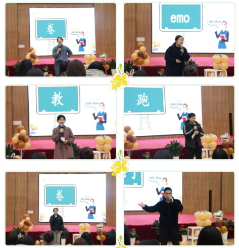 7位聪明机智、能说会道、自带喜感的各学科教师代表,用5分钟的时间聚焦“卷、emo、教、跑、快、绝绝子”这些关键词,例举了让自己印象深刻的瞬间或事件,“吐槽”了入校至今的“辛酸史”。湖东路校区少先队大队辅导员陈康主任作为一名专业的音乐教师,更是用即兴的钢琴伴奏,点燃了全场笑点。