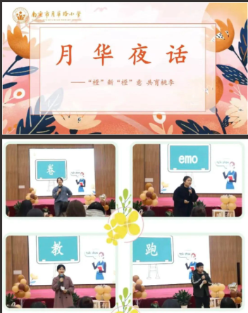 新教师从校园“象牙塔”走向社会,学校是他们成长的掌灯者、引路人。两校区共办全新的“月华夜话”,以“‘橙’新‘橙’意,共育桃李”为主题,代表着学校对新教师成长的期待。这些月华园的“新花匠”们,“新”光熠熠、活力四射,在“脱口秀”的妙语连珠中吐露心声;在“月小新教师成长记”中回顾成长;同事、师父、父母的祝福短片,让他们倍感温暖;夏翠莲校长等校领导的深情寄语,让他们充满力量。