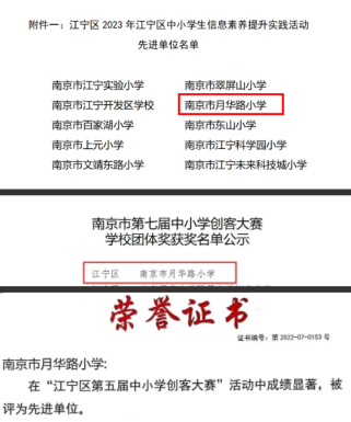 在江宁区中小学信息素养提升实践活动中,两校区共有102项学生作品获奖!其中,张冰、高雅洁、王舒欣、李阳四位老师荣获“优秀辅导教师”称号,学校也因此被评为“先进单位”。在至善路校区梁梦云、周姝月、耿天誉等老师及学生的共同努力下,学校在南京市第七届、江宁区第五届创客大赛活动中,斩获佳绩。在学校提交的作品中,有43组学生获得区级奖项,其中,一等奖6组、二等奖17组、三等奖20组,梁梦云和周姝月两位老师获得“优秀指导教师”称号,学校被评为“江宁区第五届创客大赛先进学校”。在市级比赛中,共有31组学生获奖,其中,一等奖13组、二等奖10组、三等奖8组,学校也获得了“南京市第七届中小学创客大赛团体奖”。