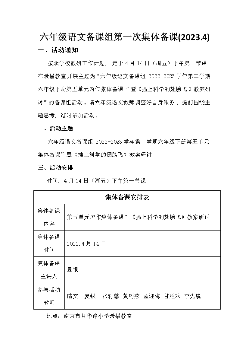 【校本研修:六年级语文备课组】第一次集体备课