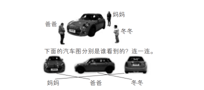 课件出示三个人观察汽车题,学生独立完成,并组织交流。