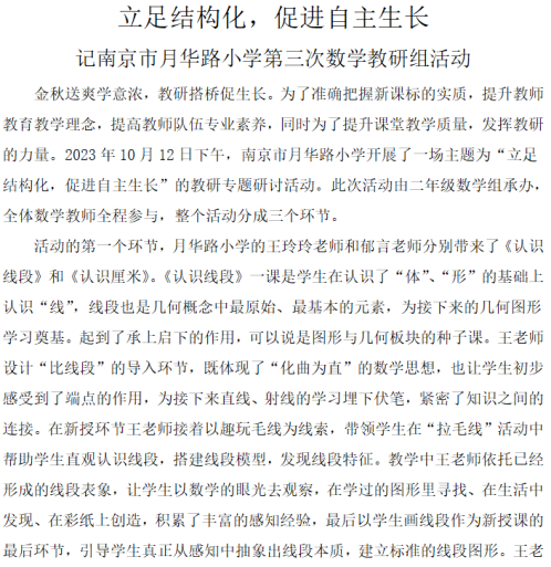 为了提升教师教育教学理念,提高教师队伍专业素养,同时为了提升课堂教学质量,发挥教研的力量。经研究,决定举行“立足结构化 促进自主生长”的教学观摩研讨活动,请全体数学教师调整好自身课务,提前围绕主题思考,并准时参加活动,也欢迎其他学科教师来参与本次的数学组教研活动。